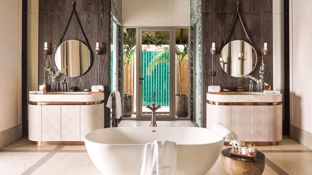 Inside, the mood shifts from its younger sister JOALI BEING’s aquamarine minimalism to a more classic, quietly opulent design language. Think warm wood, soft neutrals, and thoughtful details. Two TVs nod to the idea that you could watch something here, though if you actually do, I reserve the right to judge. There are his‑and‑hers sinks, a separate dedicated vanity table, and a bathrooms fitted out in emerald marble.
