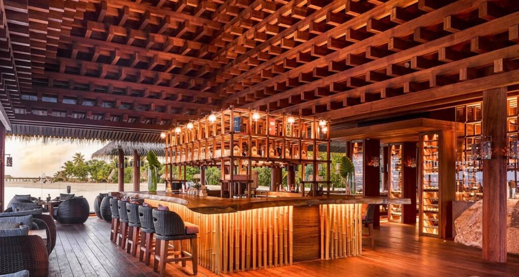 • SAOKE: the showstopper. A stilted Japanese restaurant designed by Noriyoshi Muramatsu (the mind behind the interiors of Zuma addresses globally), all clean lines, bamboo, and a breathtaking timber lattice ceiling evoking traditional kumiko work. Beneath you, reef sharks cruise lazily. Before dinner, a box of chopsticks and sake cups appears; each piece is unique, and you’re asked to pick the ones that “call to you”. It feels a bit like Ollivander’s wand shop, and I naturally chose the chopsticks that most resembled a wand and a crimson sake cup. Highlights: A5 wagyu, sumiyaki‑grilled black cod (my co‑travellers, Nobu veterans, remarked it exceeded the original), Maldivian lobster, and pristine sushi and maki. “The only reason we don’t have a Michelin star is that the guide hasn’t come to the Maldives yet,” our server said, only half‑joking.